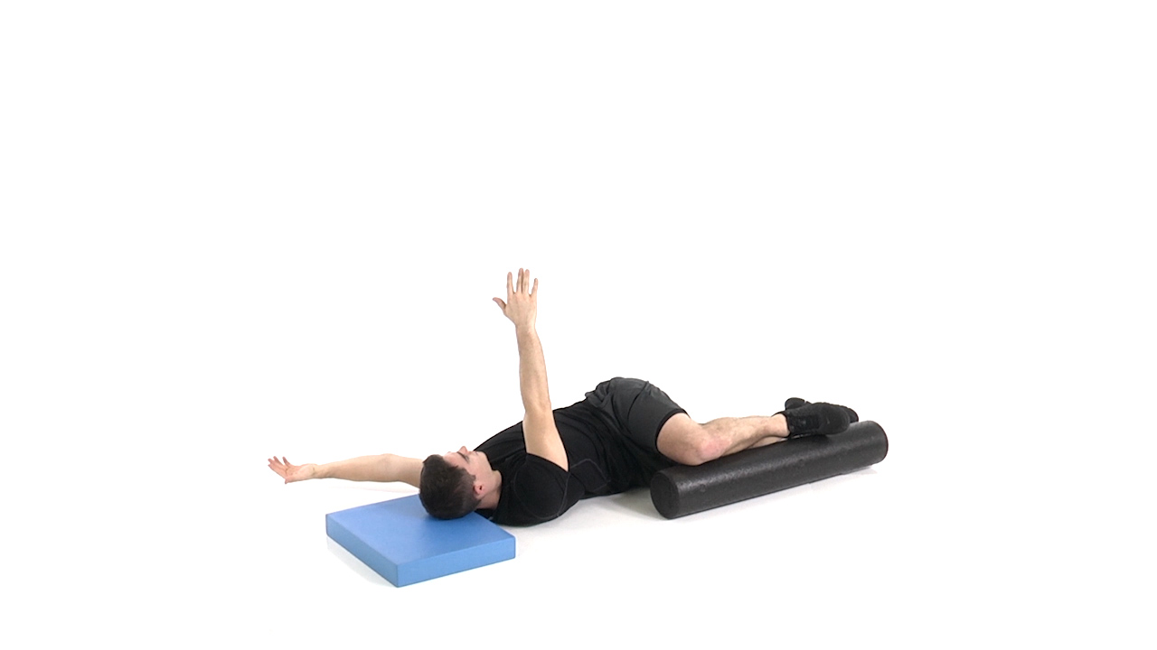Keeping the top knee bent and in contact with the foam roll focuses the stretch on the thoracic spine. This is a self-stretch and mobility exercise for T-Spine rotation incorporating active reaching. Bend you right leg so your knee is front of you and keep your left leg extended straight down so that your left foot touches the floor behind your right leg.